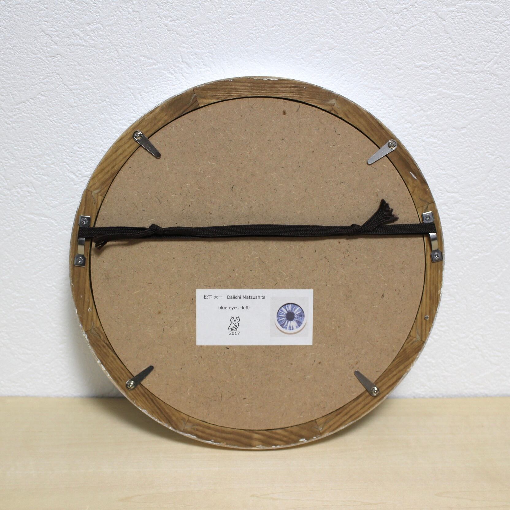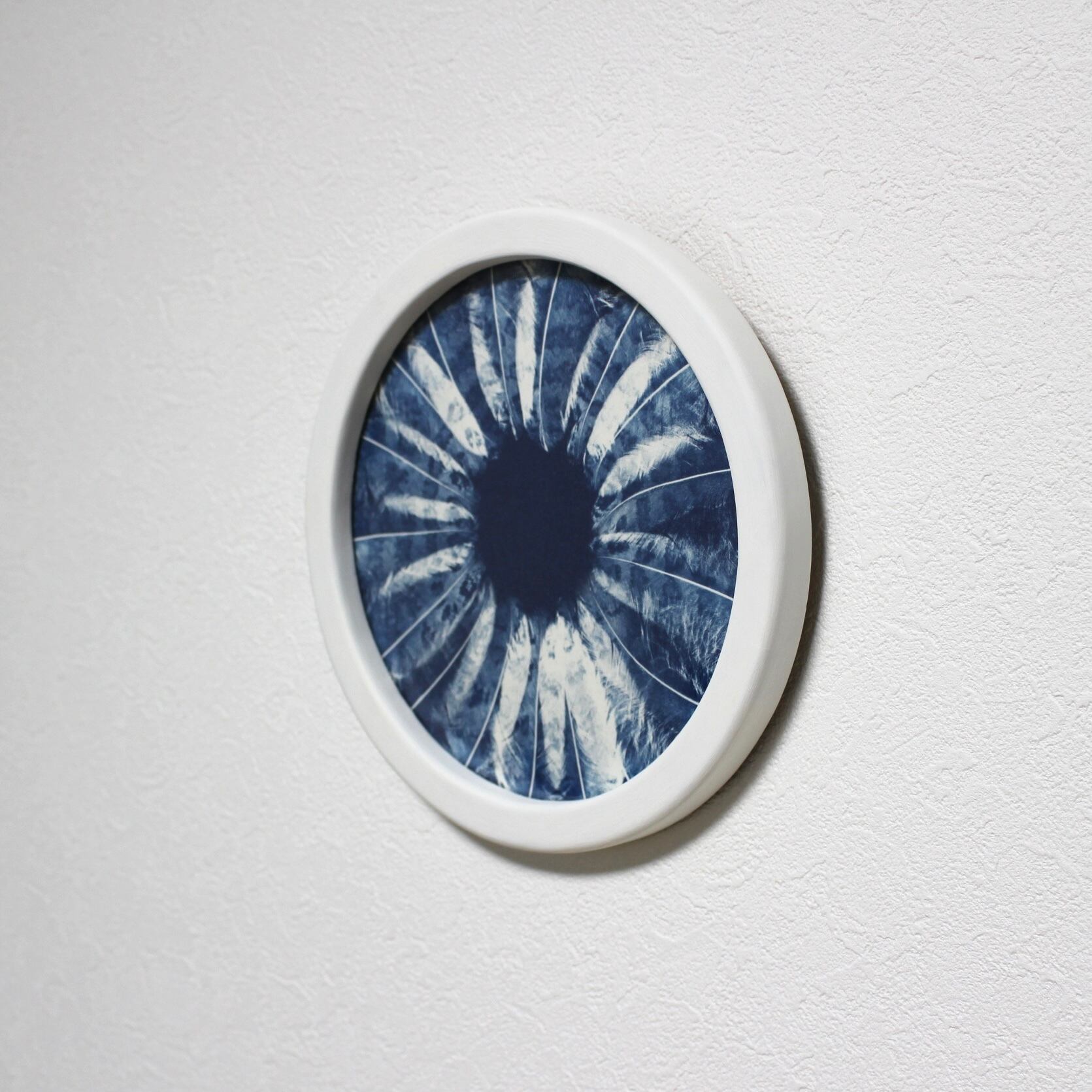 Frame size: 直径225(mm) サイアノタイプ(cyanotype) フクロウの目をイメージしています。フクロウの羽根を使い、紙に焼き付けて現像しました。