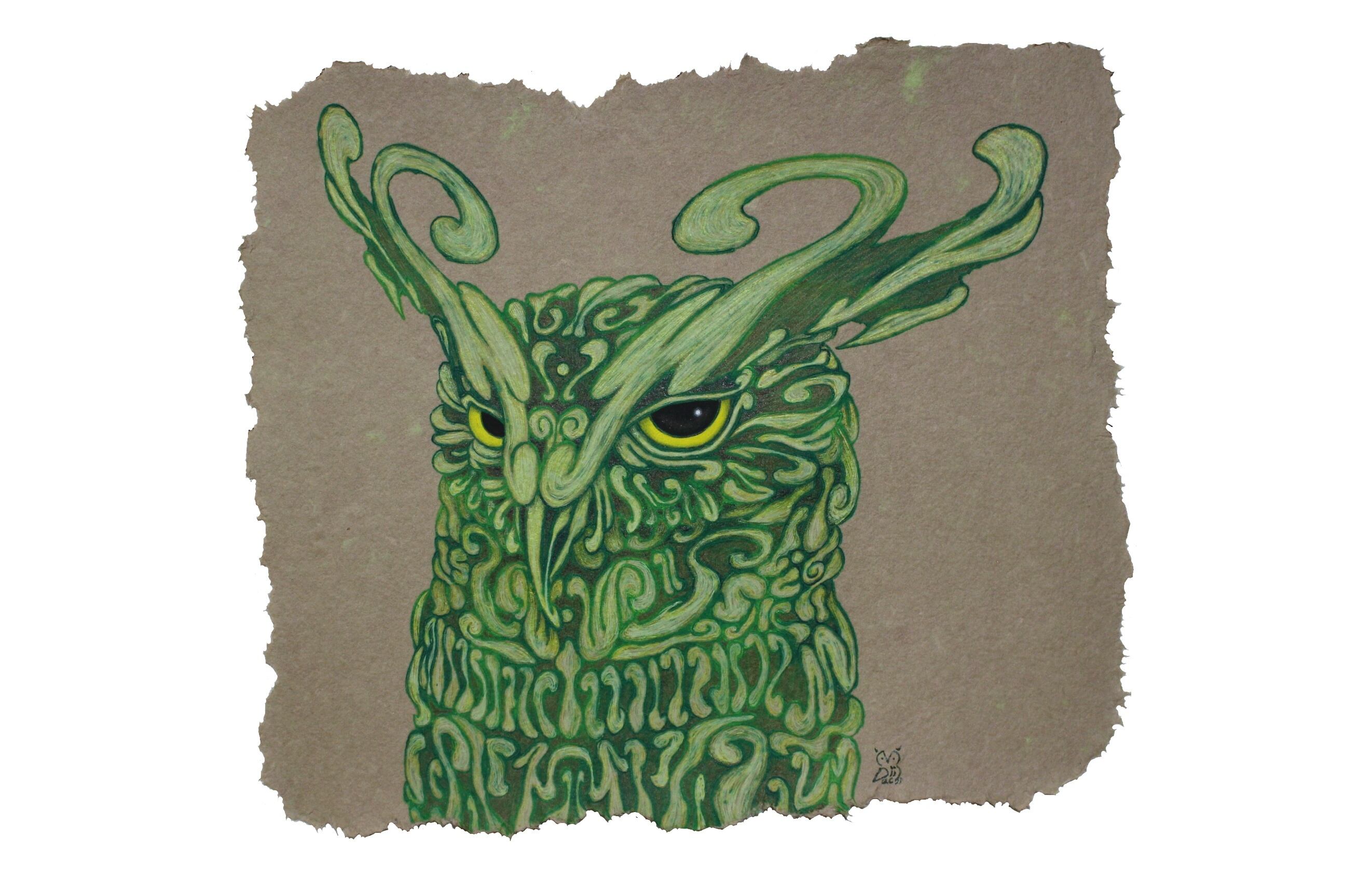 風のうねりを模した架空の縄文土器をテーマにしたフクロウです。古代の風を司る神をイメージしました。