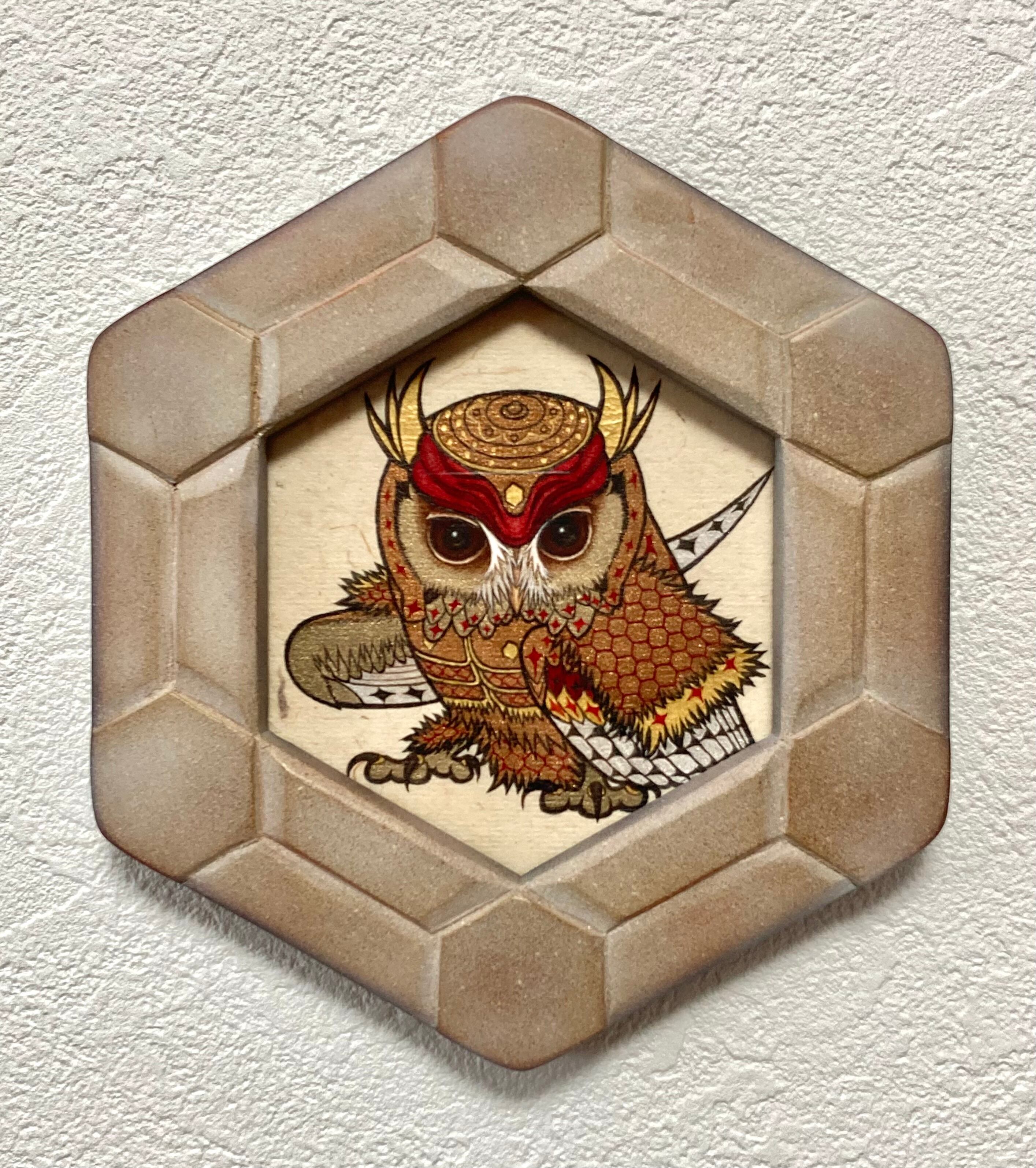 「Owl Warrior Legends」シリーズ。モデルは、立花鑑虎所用 鉄錆地桜文亀甲金畳具足と、カラードコノハズクです。